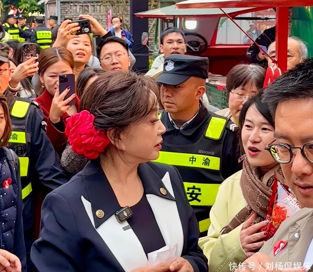 别看年纪这么大,但是粉丝依旧一连串,后面的观众追着她拍照,有十几个保安手拉着手给刘晓庆开路,并且还有专门的保安维持秩序后,现场才没显得那么乱。